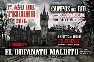 El miedo y el terror continúa el domingo 30 de octubre en la biblioteca municipal, Diego HS y Candilejas Teatro presentan por primera vez en la localidad, bajo la dirección de Marisa Almela, “El Orfanato Maldito”, una terrorífica representación donde los actores introducen al público asistente en un lugar en el que sólo los más valientes y atrevidos conseguirán recorrerlo sin gritar ni huir despavoridos para salir de el guiados por las distintas cartulinas que deberán encontrar para conseguir completar el recorrido y finalmente hallar  la salida. Aunque el espectáculo tiene una duración aproximada de 10 minutos, los actores interpretan sus escenas durante más de 3 horas seguidas.