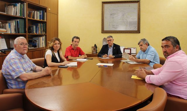 El presidente de la Confederación Hidrográfica del Segura, Mario Urrea, junto al Comisario de Aguas, Francisco Javier García, y el Comisario Adjunto, Adolfo Mérida, han mantenido una reunión de trabajo con la alcaldesa de Campos del Río, María José Pérez Cerón, acompañada por representantes de las comunidades de regantes del municipio.